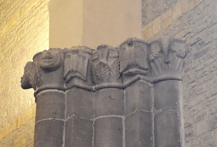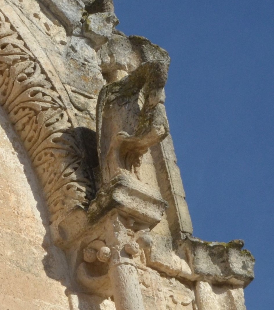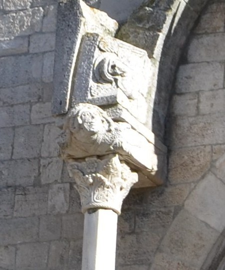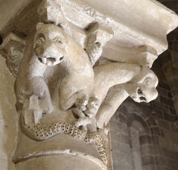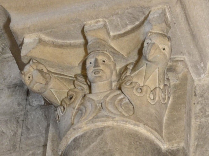 in questo capitello posto all’interno della chiesa compare un busto umano affiancato dalle teste di due animali fantastici di grande vigore plastico. La natura aviaria e il becco appuntito delle bestie farebbero pensare a dei grifoni