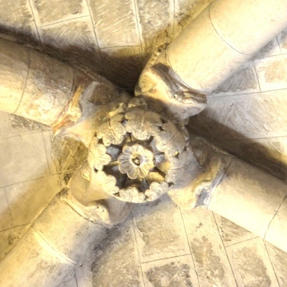 la chiave di volta di questa campata della chiesa presenta, al centro, una composizione floreale e, all’innesto dei quattro costoloni, delle teste di animali fantastici di difficile identificazione. Dalla forma assimilabile a quella di delfini, sembrerebbero essere figure mostruose da collegarsi col mondo marino o, comunque, acquatico