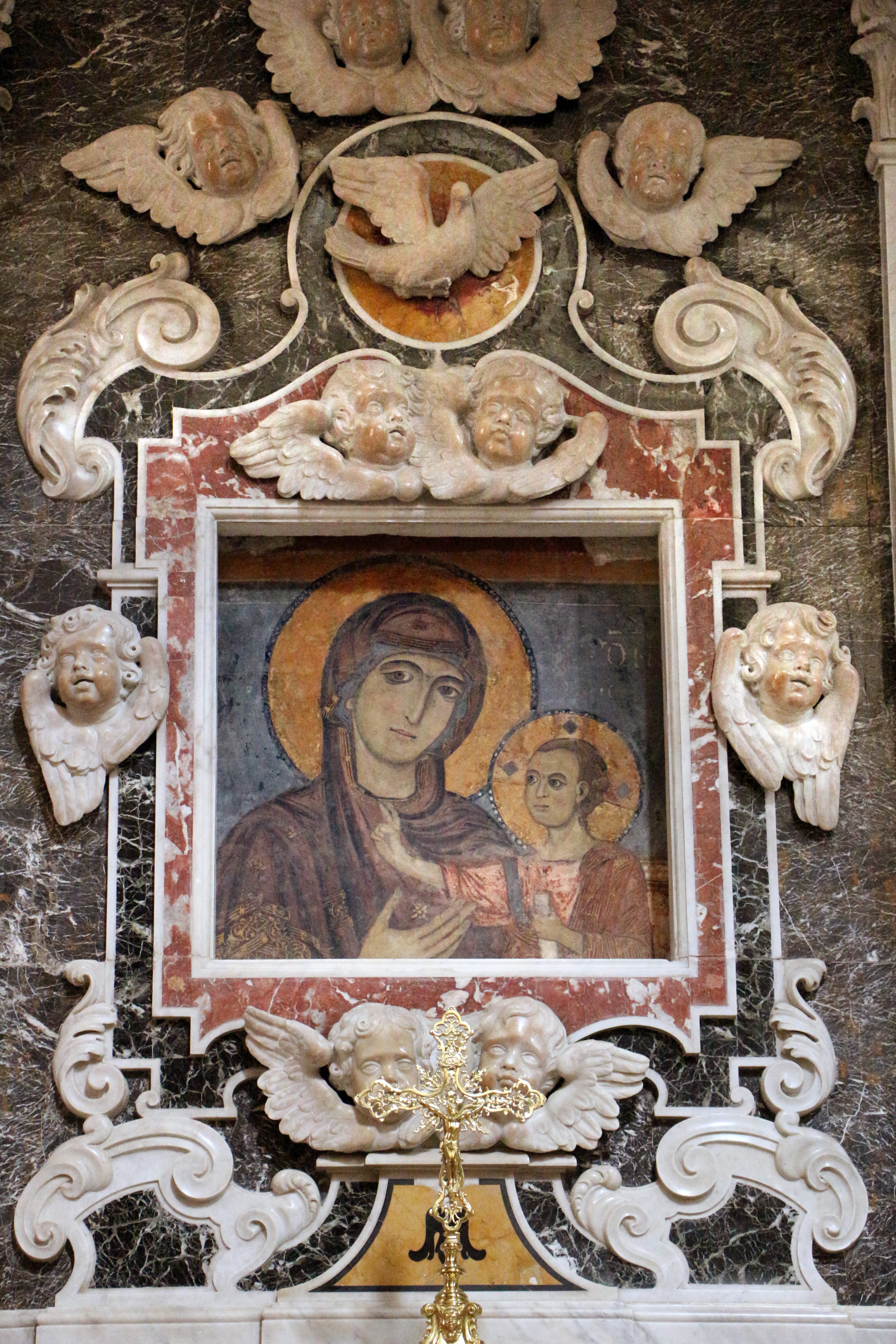 questa Madonna con Bambino e angeli fu rinvenuta durante i restauri seguiti al terremoto del 1930. Lâaffresco, inserito entro unâincorniciatura barocca e purtroppo pesantemente ridipinto, affianca a degli innovativi spunti di marca occidentale (si veda la decorazione del dossale del trono e lâaccenno, grazie alla posizione degli angeli, a una spazialitĂ piĂš articolata) ancora un forte legame con i precedenti stilemi di gusto bizantineggiante (soprattutto, si veda la staticitĂ della figura della Madonna, la posa del Bambino e i nimbi madreperlacei)