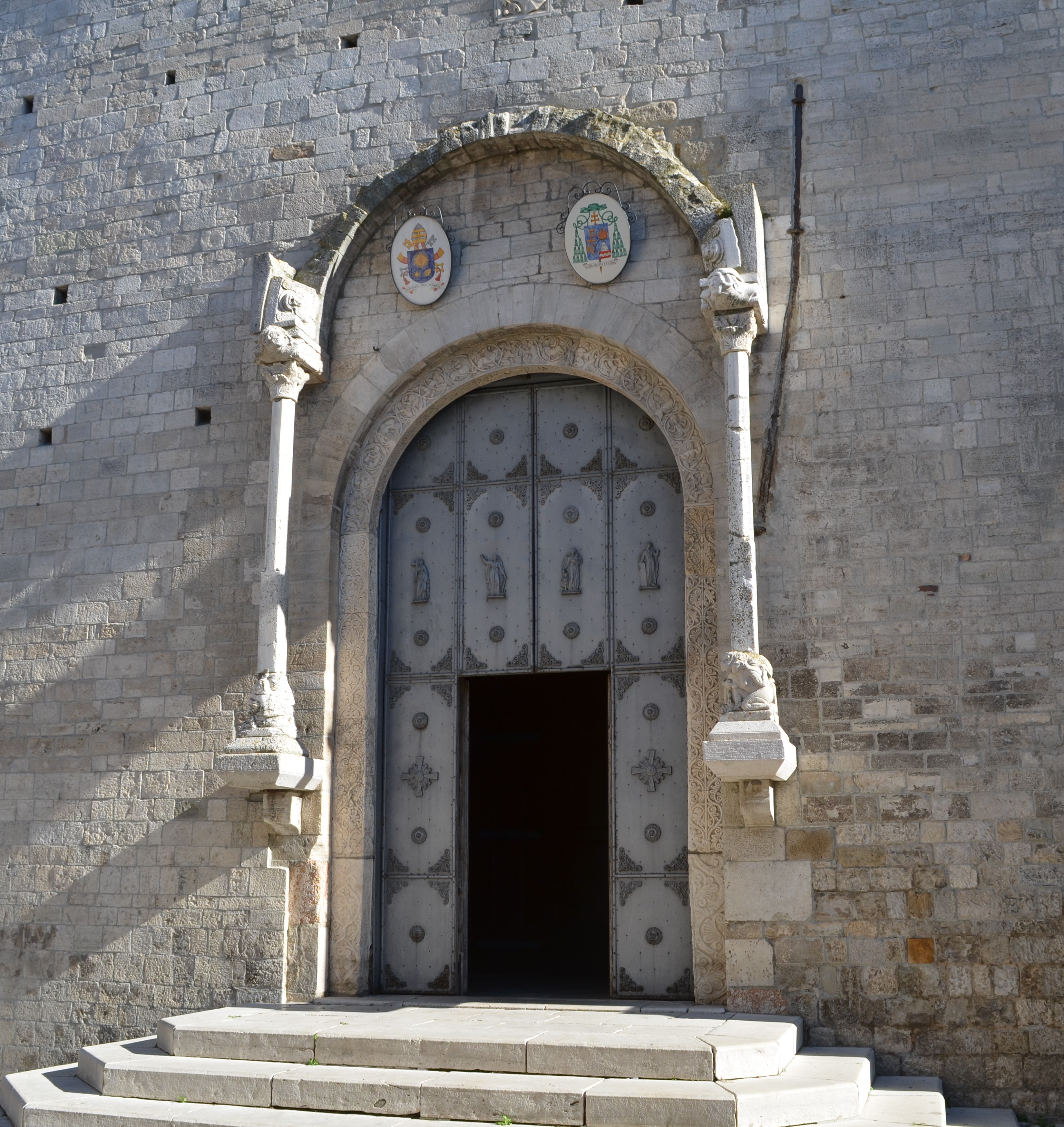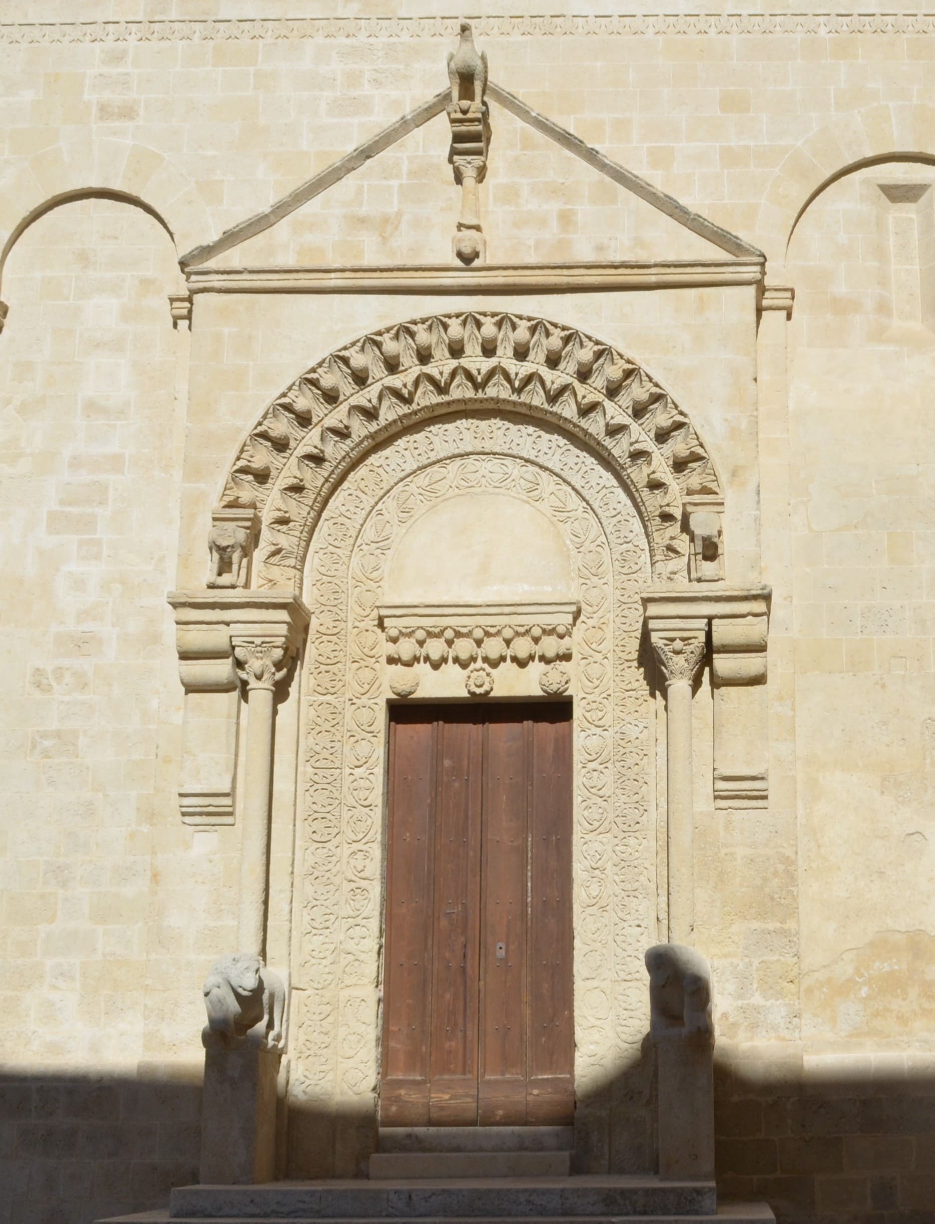 il portale detto âPorta dei Leoniâ della parete sud della cattedrale presenta un orientamento âantiplasticoâ della decorazione e legato ancora a motivi scultorei di chiara ascendenza romanica tratti dalle limitrofe esperienze pugliesi. In particolare, si vedano gli stipiti e lâarchivolto a doppia fascia decorati con motivi vegetali, lâarchitrave ornato da una teoria di testine e le colonnine sorrette da leoni stilofori