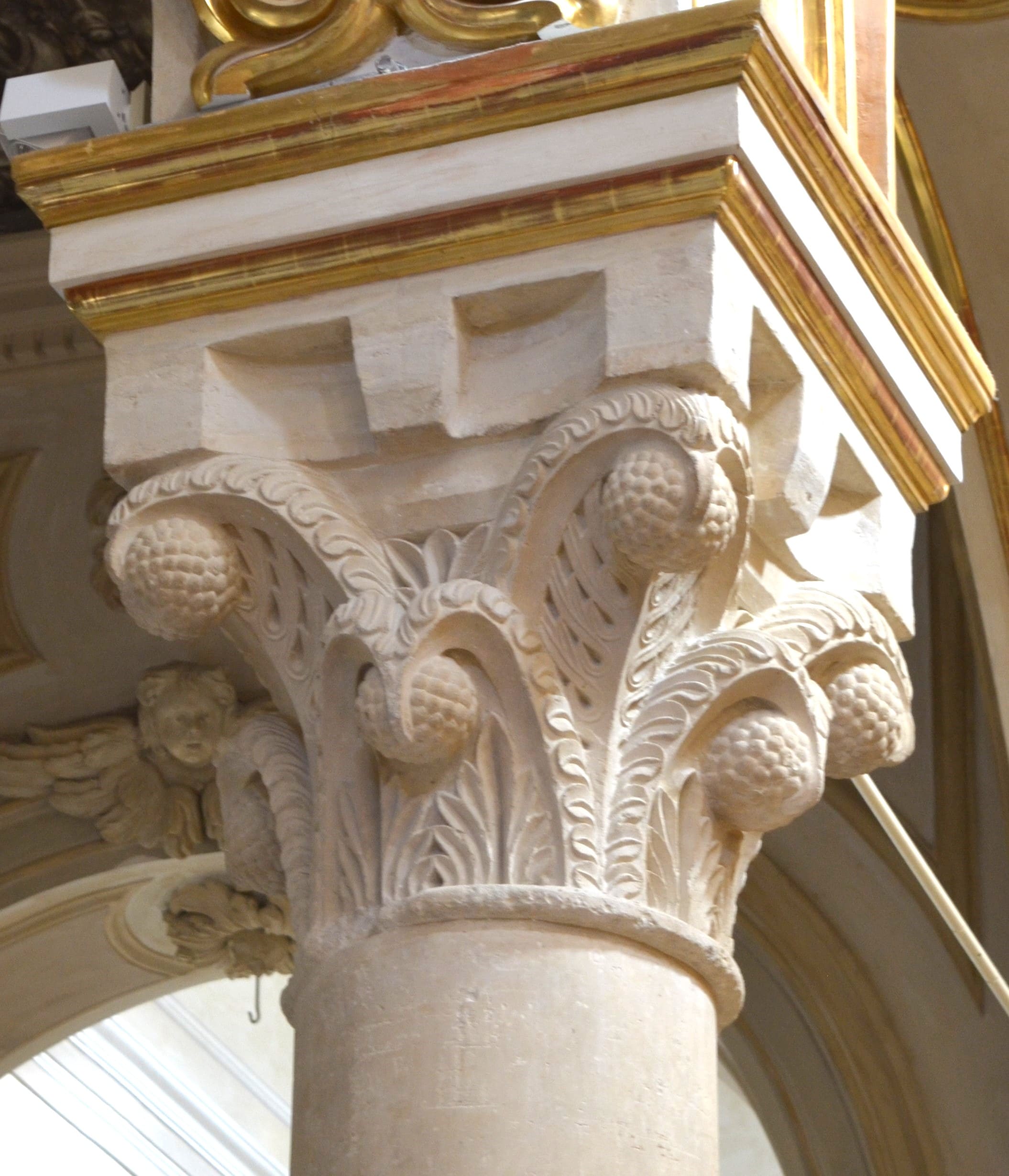 il presente capitello è decorato a foglie dallâapice ricurvo e frutti penduli . Se nei crochets (elemento uncinato) si ravvisa un gusto naturalistico e unâevidenza plastica tipici della contemporanea cultura figurativa di stampo federiciano, la corpositĂ dei volumi dei frutti rivela il persistere ancora di una concezione romanica della forma tratta dalle limitrofe esperienze pugliesi mentre l'astrazione grafica dell'elemento naturalistico richiama il tradizionale gusto islamico e orientale