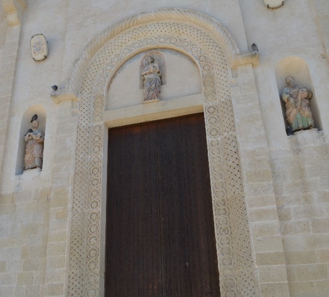 il portale maggiore della chiesa presenta un orientamento âantiplasticoâ della decorazione e legato ancora a motivi scultorei di chiara ascendenza romanica, tratti dalle limitrofe esperienze pugliesi. In particolare, si vedano gli stipiti, lâarchitrave e lâarco interno decorati con due fasce di bassorilievi a girali fogliacei dallâintaglio netto e profondo, le ghiere esterne scolpite con motivi a foglie dâacanto e a pigna e le foglie ripiegate e le protomi umane posizionate subito sotto la cornice della lunetta