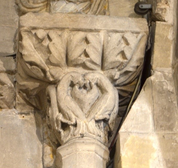 questo capitello presenta una cornice divisa in due ordini decorati con un doppio motivo fitomorfo (ovvero di forma vegetale). Sebbene quello inferiore, con il rovesciamento in avanti delle foglie di acanto, riconduca alla coeva scultura gotica del nord Europa, quello superiore, con le foglie realizzate con un gusto grafico e bidimensionale dal sapore arcaizzante, si presenta in linea con la tradizione artistica precedente
