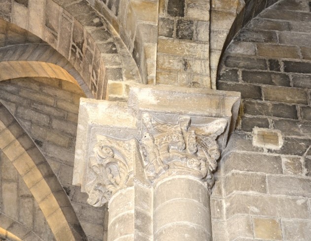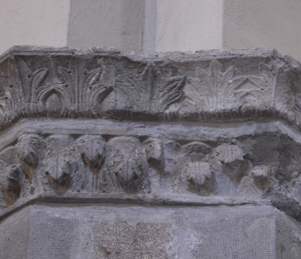 allâinterno della chiesa, gran parte dei capitelli rendono i decori in maniera plastica, corposa, dilatata, dimostrando una chiara apertura verso la scultura gotica francese mutuata attraverso le esperienze latine della Terra Santa e lâarte svevo-federiciana. Dâaltra parte, alcuni esemplari propongono ancora un orientamento âantiplasticoâ della decorazione, legato a motivi scultorei di chiara ascendenza romanica tratti dalle limitrofe esperienze pugliesi. Ne è un esempio il presente capitello, con coppie di uccelli affrontati e parte inferiore dellâabaco scolpita a foglie, realizzato con profondi sottosquadri