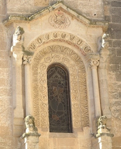 la decorazione plastica dellâabside della chiesa combina, nella monofora, il senso corposo e quasi a tutto tondo del motivo a fogliette (scolpite nellâatto di schiudersi) dellâarchivolto esterno con il linguaggio, ancora legato a motivi scultorei di chiara ascendenza romanica tratti dalle limitrofe esperienze pugliesi, della fascia a girali e in quella a foglie dâacanto che contornano gli stipiti e lâarchivolto della finestra (cosĂŹ come nei capitelli e nelle statue a carattere zoomorfo che la decorano)