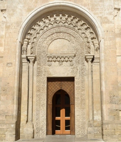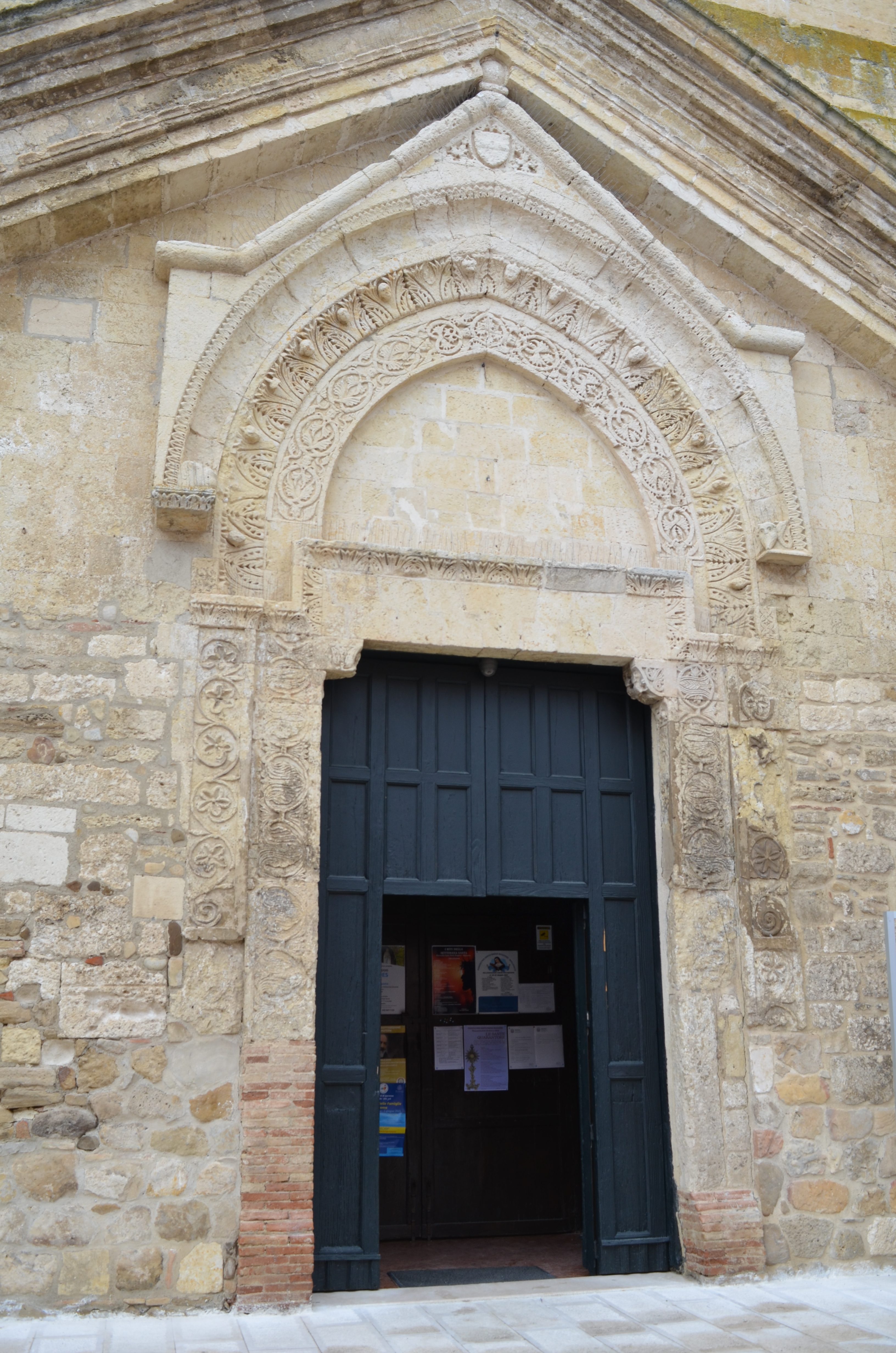 il portale maggiore della facciata della Cattedrale presenta un orientamento âantiplasticoâ della decorazione e legato ancora a motivi scultorei di chiara ascendenza romanica tratti dalle limitrofe esperienze pugliesi. In particolare, si vedano gli stipiti e lâarchivolto articolati in due fasce decorate, una con tralcio vegetale e lâaltra con un motivo a intreccio