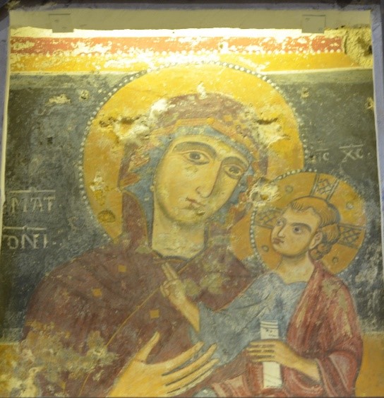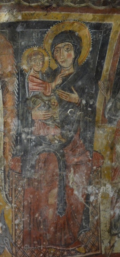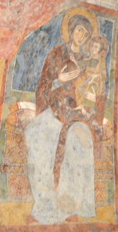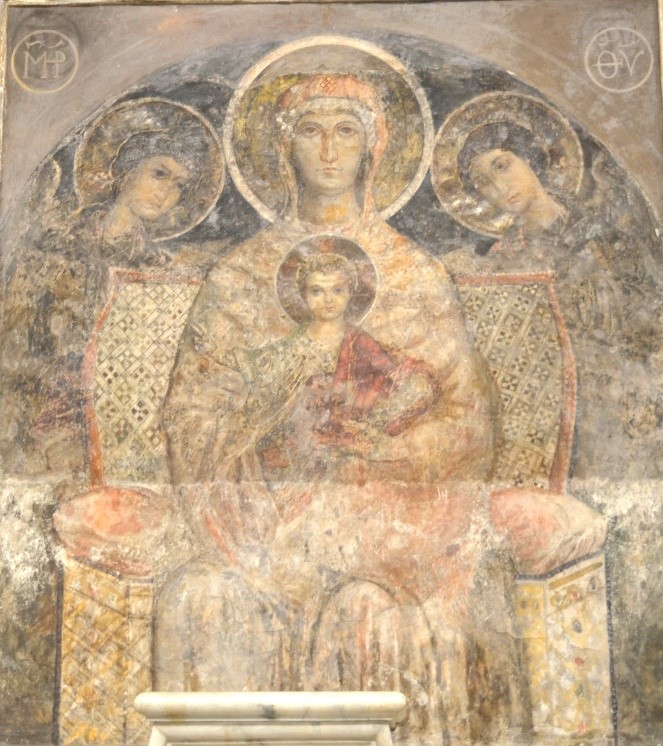 nonostante questa chiesa rupestre si caratterizzi per la presenza di affreschi aggiornati alle tendenze internazionali dellâarte della corte angioina di Napoli, alcune immagini qui campite, come questa Madonna con Bambino, risentono ancora di una forte influenza della precedente tradizione stilistica bizantina