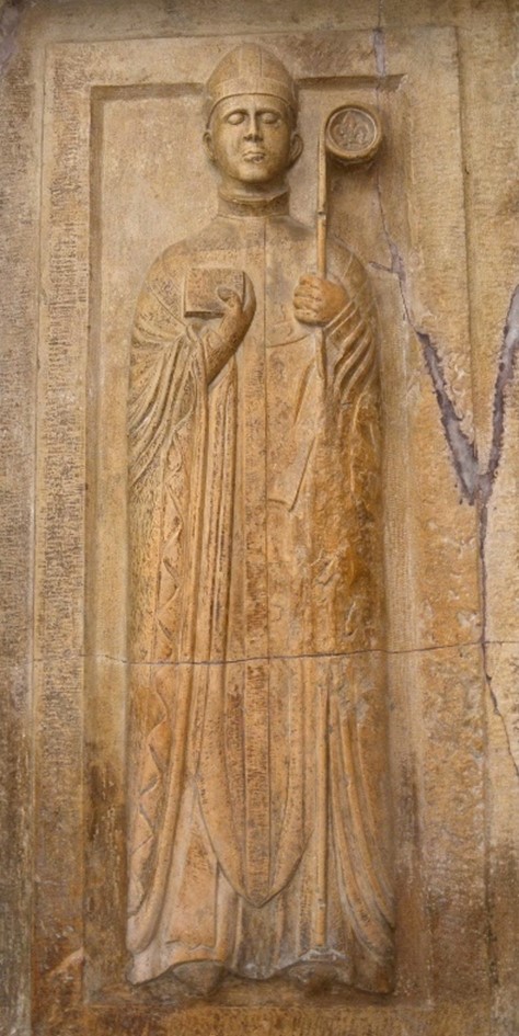 questa la lastra tombale di vescovo, sebbene sembri aver assorbito le novitĂ plastiche introdotte nella Napoli di primo Trecento dagli scultori romani della cerchia di Arnolfo di Cambio, presenta ancora caratteristiche tipiche della scultura lucana duecentesca. Si veda, per esempio, il linearismo, la scarsa rilevanza volumetrica e la rigida posizione frontale della composizione