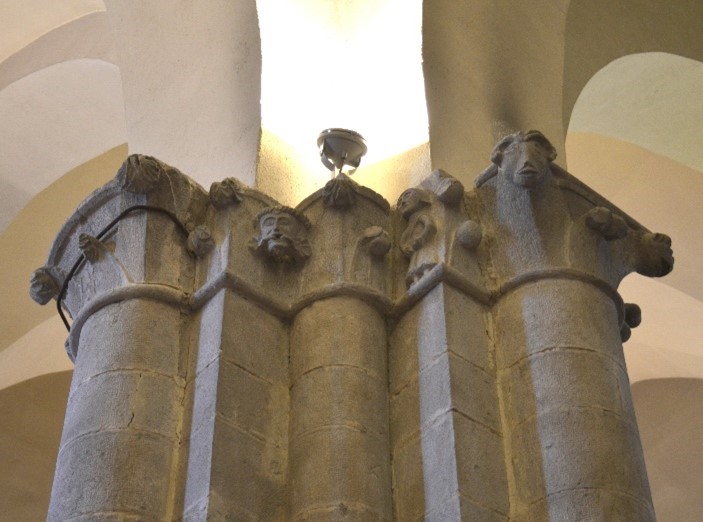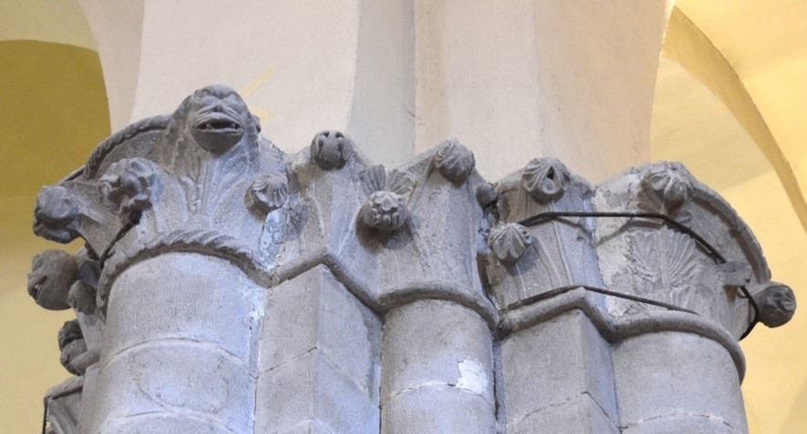 questi semicapitelli decorati con foglie dâacanto, figure umane, teste di ariete e mascheroni combinano il linguaggio stilistico della coeva produzione gotico-borgognona del Nord Europa con le precedenti esperienze del Romanico pugliese e lucano, dando vita a forme turgide, incavi taglienti e superfici levigate unite a un gusto per il grottesco e per la saturazione degli spazi disponibili