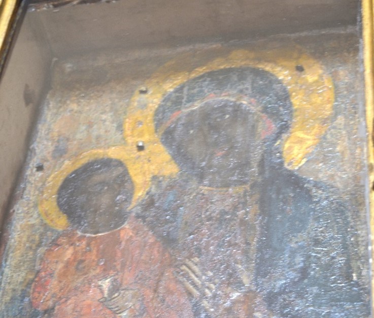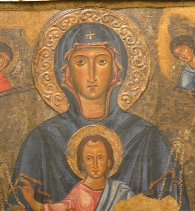 la presente Madonna con Bambino (attualmente solo in parte visibile perchĂŠ inserita entro una sfarzosa cornice dâorata) è da ricollegarsi alla produzione delle comunitĂ monastiche italo-greche della zona del Vulture e, nonostante il clima occidentale dellâinsieme e le sue specifiche inflessioni occitaniche, risulta ancora fedele ai moduli espressivi della tradizione bizantina. Per esempio, si veda lâiconografia tipicamente orientale, la fissitĂ degli sguardi, la forma a triangolo rovesciato dei volti e la rigiditĂ dei panneggi