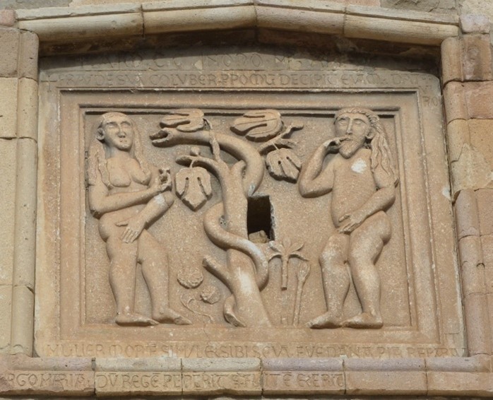 il rilievo relativo al Peccato originale (Adamo ed Eva posti ai lati dellâAlbero proibito con il Serpente che li induce a disobbedire) presenta, dal punto di vista stilistico, ancora un evidente legame con la tradizione precedente. Infatti, le figure, incise e schematiche, sono ancora caratterizzate da una forte bidimensionalitĂ e da un accentuato appiattimento dei volumi; e inoltre, i corpi, i volti e le mani sono trattati con evidente grossolanitĂ e risultano rigidi nelle forme e nel rapporto con lo spazio