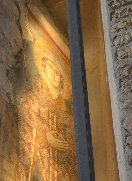 questo affresco, presumibilmente appartenente alla preesistente Chiesa della Madonna della Seta, sebbene sia stato realizzato tra la fine del XIII e lâinizio del XIV secolo presenta ancora degli stilemi e unâiconografia tipici della precedente tradizione bizantina. Si veda, per esempio, la resa alquanto stereotipata del volto, la postura rigida e lâassenza di volumetria del corpo (completamente nascosto dal vestiario) e si consideri, inoltre, lâutilizzo di indumenti che si rifanno alla specifica tradizione liturgica orientale: lo sticharion (una sorta di camice) con polsini riccamente ornati; il felonio (una sorta di casula o pianeta) decorato da motivi a girali e orbicoli perlinati; e lâomoforio (una sorta di stola) ricamato da grandi croci nere