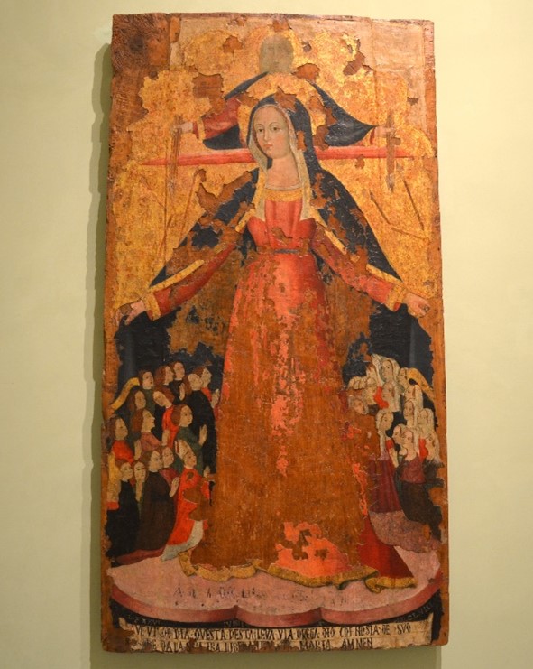 questa Madonna della Misericordia (Vergine Maria che ripara sotto il suo mantello due gruppi di devoti dalle frecce scagliate dallâalto da Dio-Padre), partecipe delle esperienze veneto-marchigiane e prodotta da un pittore della cerchia di Giovanni Charlier presumibilmente chiamato in loco, lascia intravedere spunti e stilemi che dimostrano la conoscenza della cultura artistica del Rinascimento ma, nella sostanza, si presenta ancora legata a moduli tardogotici per la generale conduzione dellâimpianto compositivo e per lâuso del fondo dâoro