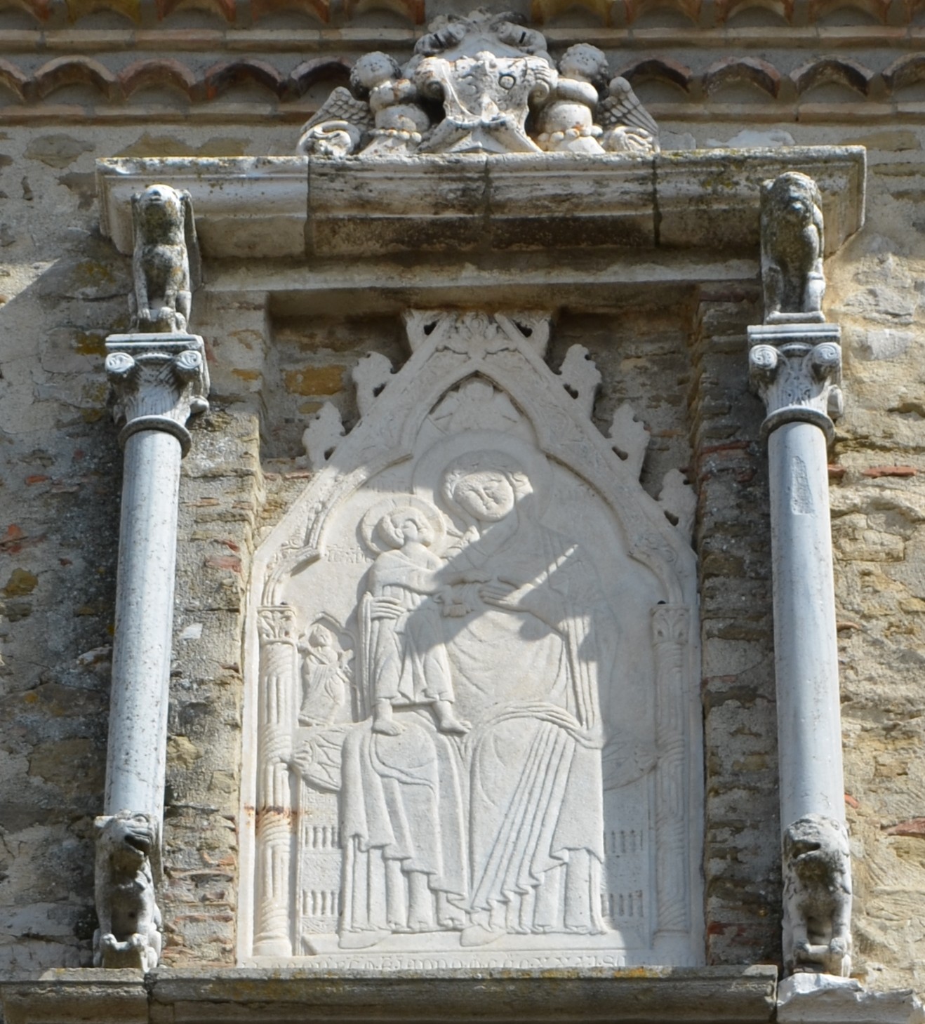 questa scultura, sebbene presenti elementi iconografici aggiornati al recente formulario gotico, in realtĂ propone ancora un linguaggio figurativo alquanto arcaizzante. Infatti, da una parte, si veda la presenza di motivi architettonici tipicamente gotici (archi a ogiva e fioroni salenti) nel timpano dellâedicola o lâiconografia della figura del Bambino eretto e âpassanteâ da un ginocchio allâaltro della Madre; mentre, dallâaltra, si noti lâintaglio secco e il rilievo schiacciatissimo delle figure che annullano completamente qualsiasi intento volumetrico e prospettico, tanto da dare la sensazione di essere in presenza di unâicona piuttosto che di una scultura