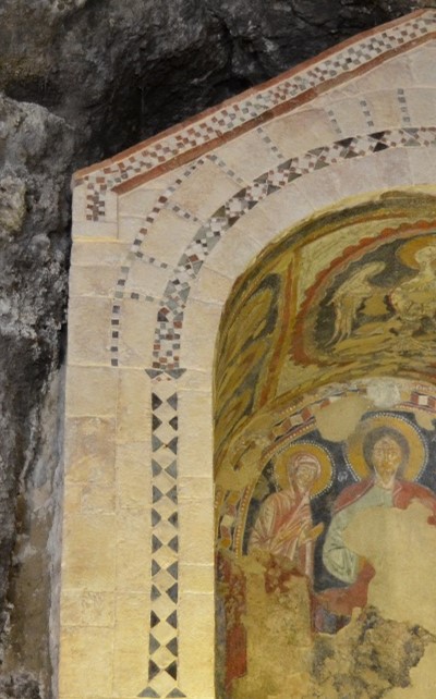 il fronte dellâedicola presente allâinterno del presbiterio della chiesa e quello dei gradini che salgono verso lâedicola stessa, con la loro decorazione a motivo geometrico romboidale dĂŹcromo realizzato alternando tarsie di pietra calcarea bianca a tarsie di pietra lavica nera, riprendono unâornamentazione di gusto orientale (islamico-bizantina) che si era diffusa in Campania