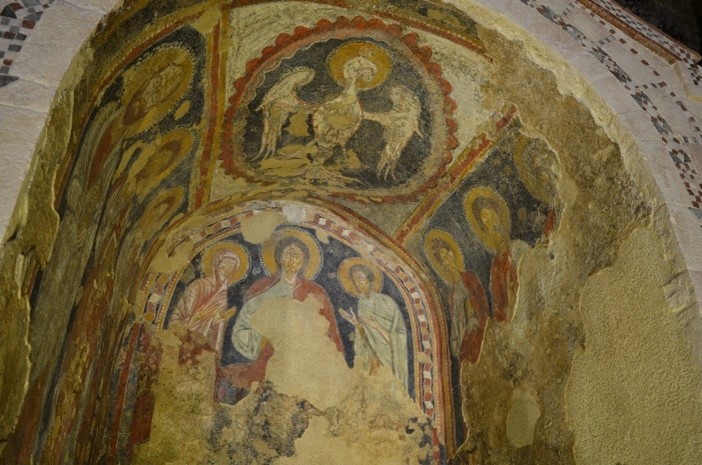 gli affreschi, raffiguranti una Deesis (scena di intercessione presso il Cristo), degli Apostoli e unâAquila nimbata (rappresentazione simbolica di San Giovanni Evangelista), che decorano lâedicola presente allâinterno del presbiterio della chiesa propongono un linguaggio iconografico e stilistico di chiara derivazione bizantina. Si veda, in particolare, la postura rigida e austera delle figure e gli occhi sbarrati e fissi dei loro sguardi.