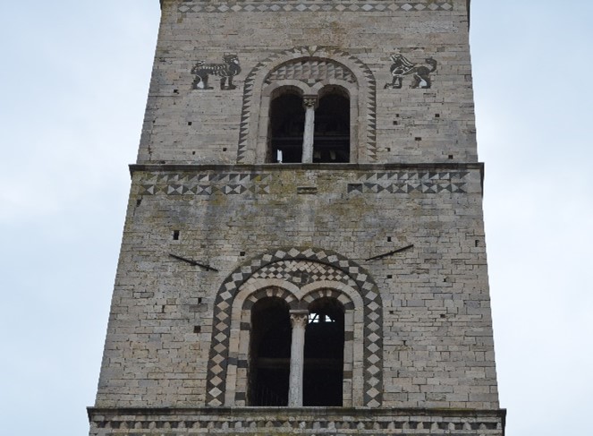 i due piani superiori del campanile presentano, nelle cornici marcapiano e nelle ghiere e nelle lunette delle bifore, un ornato a tarsie di pietra calcarea bianca alternate a tarsie di pietra lavica nera a formare un motivo geometrico romboidale e a denti di sega dĂŹcromo di gusto orientale (islamico-bizantino) particolarmente diffuso in Campania. Invece, le due figure di leoni affrontati ai lati della finestra dellâultimo piano recuperano un soggetto iconografico caro alla monarchia normanna che era ampiamente rappresentato nella produzione artistica della corte di Palermo