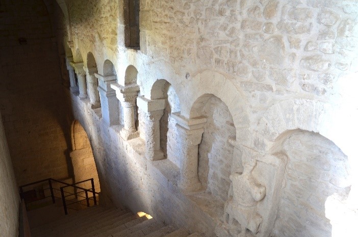 lâex portico della cosiddetta Chiesa Vecchia dellâAbbazia (successivamente inglobato nel vano scala della Foresteria) presenta al piano alto una galleria costituita da una serie di arcatelle. Questa soluzione architettonica era sconosciuta nellâItalia meridionale e riprende esempi nordeuropei, in particolar modo della Normandia. Anche gli stessi elementi scultorei decorativi, sebbene opera di maestranze locali, riflettono formalmente e iconograficamente esiti della scultura della Francia normanna. Si veda, per esempio, le figure alquanto sintetizzate dei telamoni, la rozza e semplificata fattura dei capitelli di tipo corinzio e del fregio che corre sotto le archeggiature e lâadozione del capitello bicorporato (ovvero, con due animali convergenti in angolo con unâunica testa), sconosciuto al Sud Italia ma compatibile con modelli della Francia settentrionale